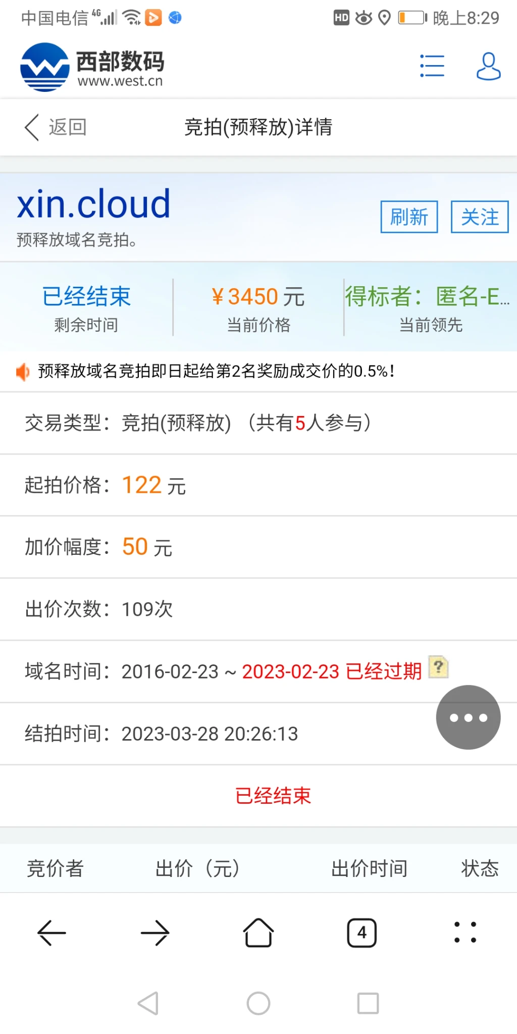 xin.cloud竞拍3450元;xin.red只要388出,要的西部秒