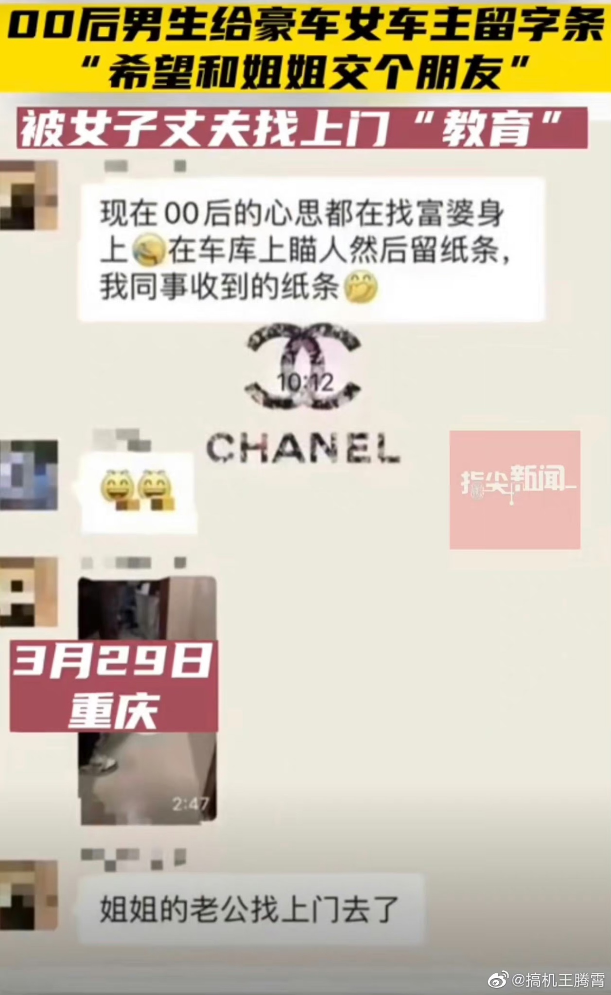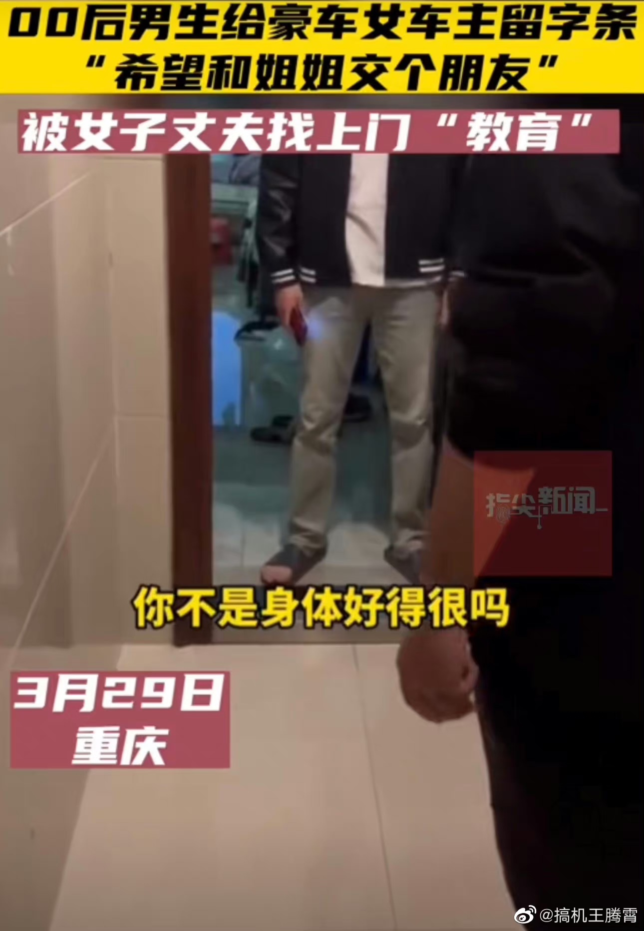 重庆一男子在小区地库看到辆保时捷911,随后写了个暧昧纸条夹在车上,声称想和富婆交朋友,自己是00年小伙子且身高一米八,不料被其丈夫找上门现场教育。