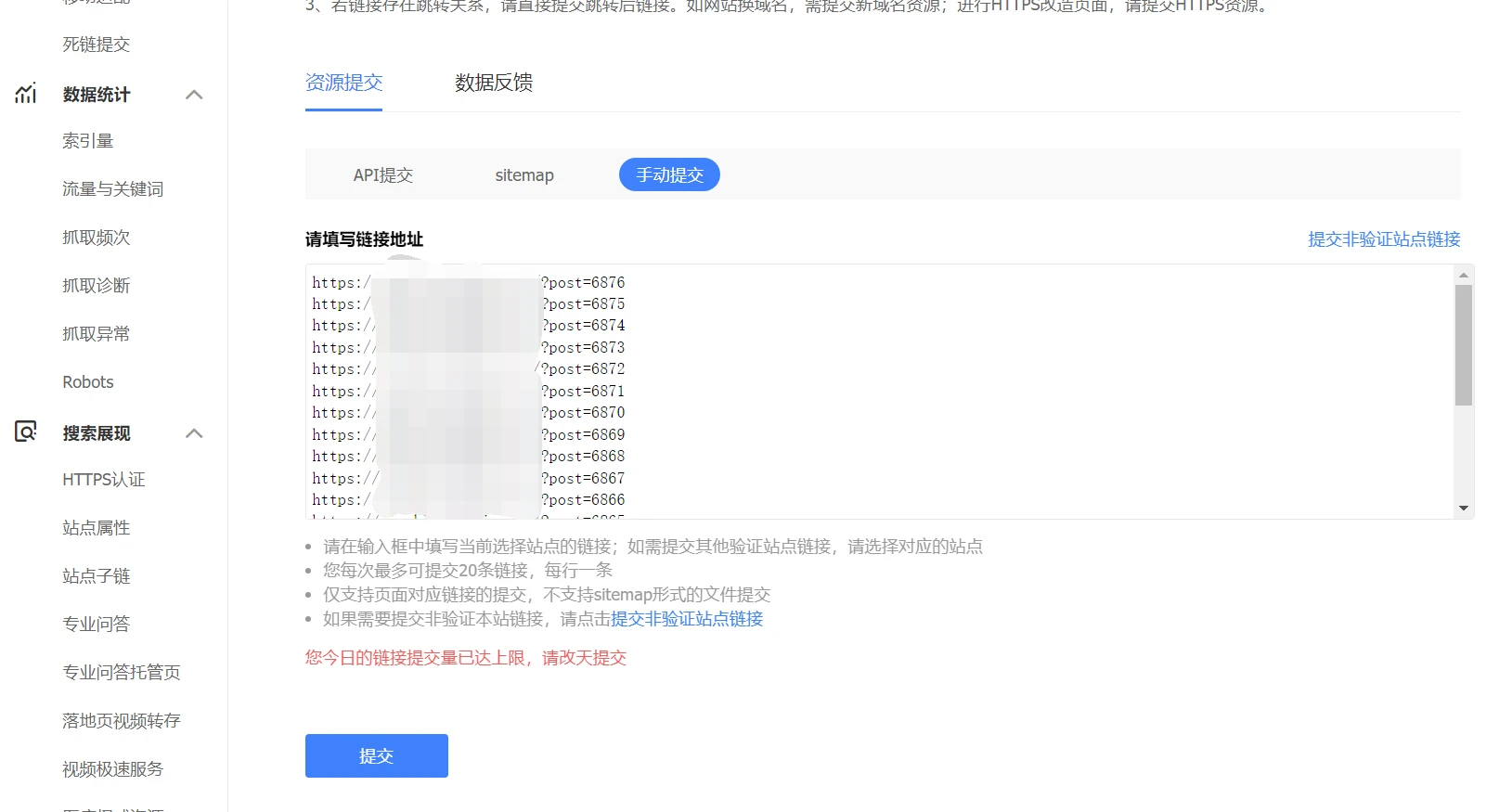 因为手动提交一次只能20个URL,提交了10次200个,就提示上限了
