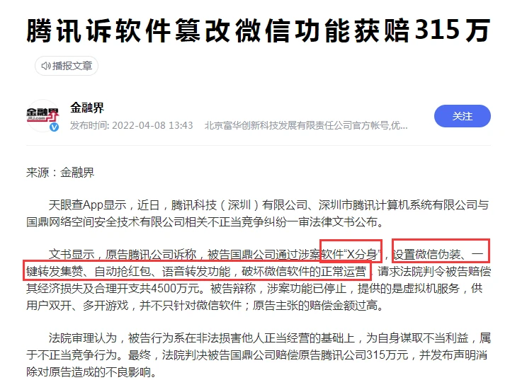 腾讯称,被告国鼎网络旗下的涉案软件“X分身”的“百宝箱”模块,提供多种改变微信正常功能的按钮,包括微信伪装、一键转发、一键积赞、消息防撤回、自动抢红包、语音转发等微信软件不具有的功能,破坏对微信软件的运营秩序,严重危险微信服务的安全性,要求被告道歉及赔偿4500万元。