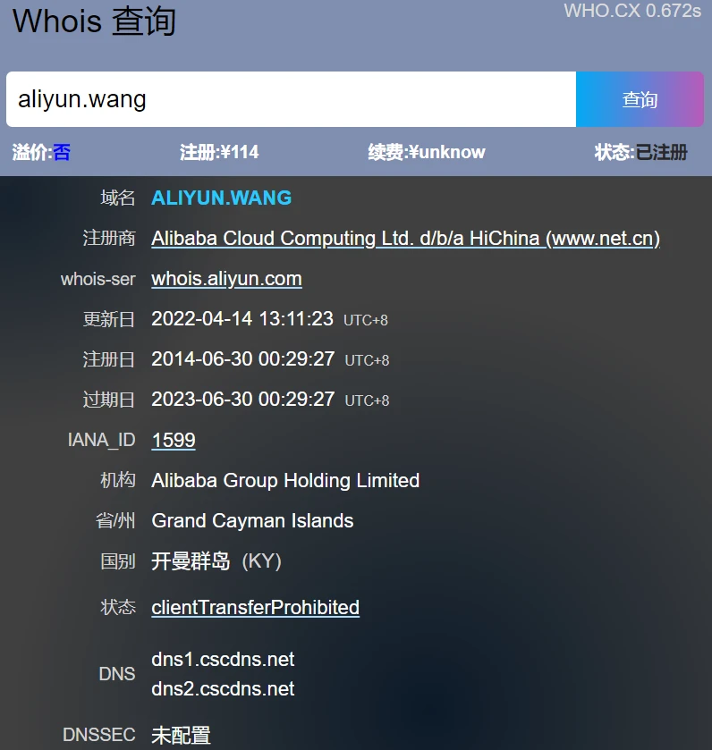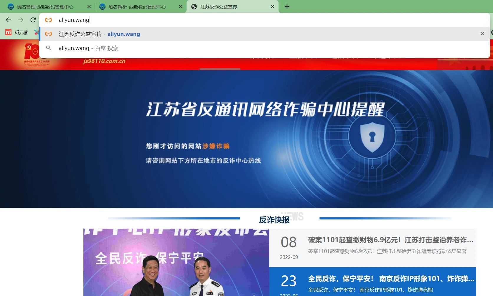 aliyun.wang是位于开曼群岛阿里巴巴控股集团注册的域名,一直是用来跳转到aliyun.com,结果今天发现被江苏反诈拦截了