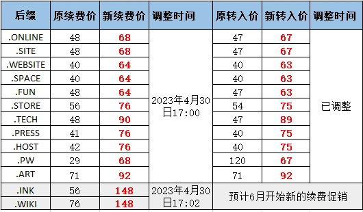 接注册局域名后缀成本上涨调整通知,我司将于以下不同时间点调整域名续费和转入价格,详情如下: