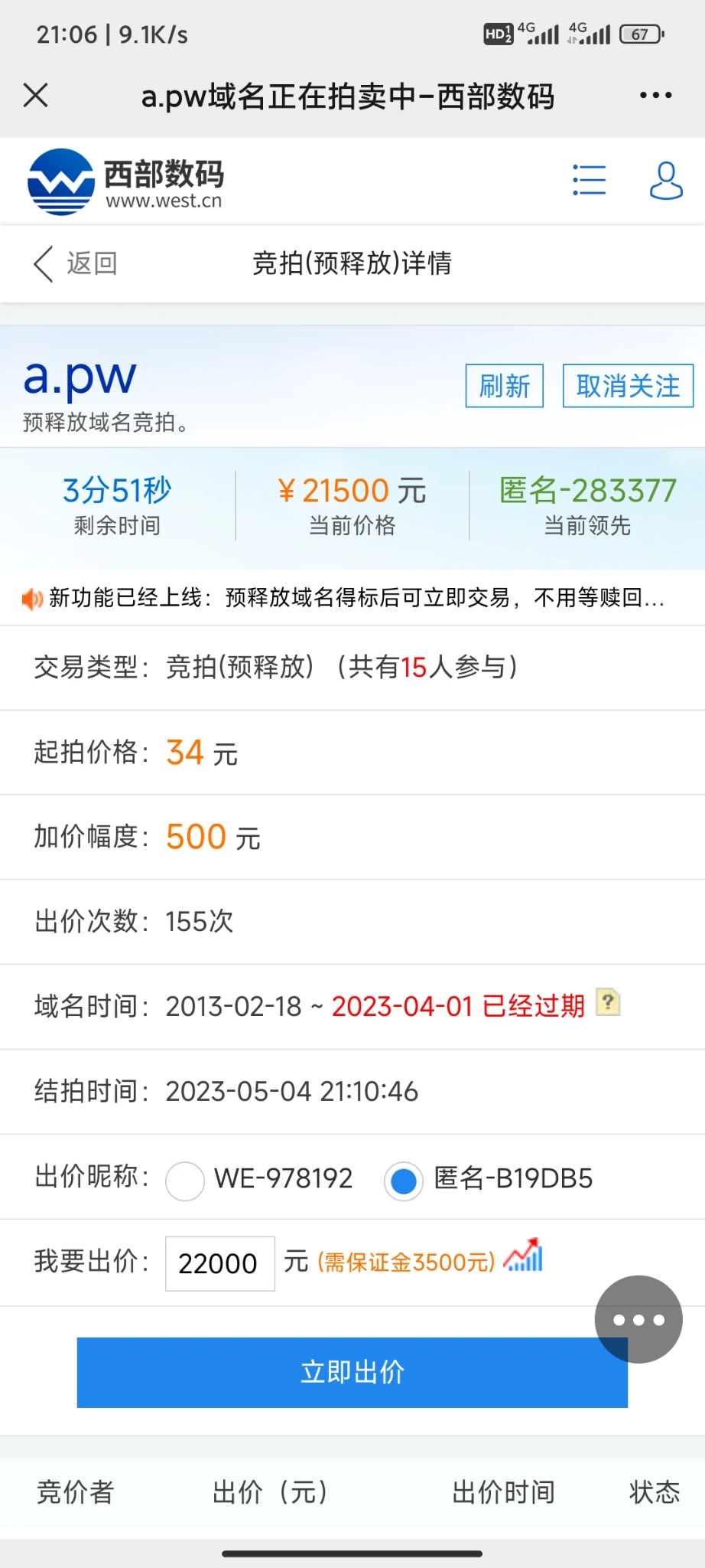 A.pw 极品单字符域名,西部数码,今晚拍卖即将结束,续费几十块钱,
