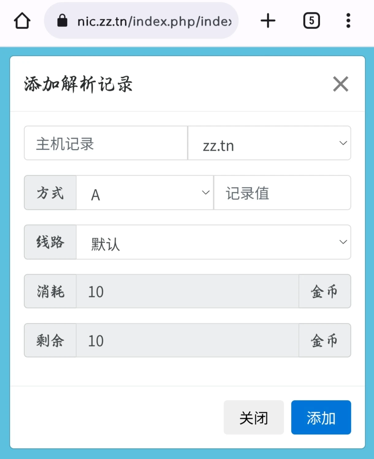 每个账号注册默认10金币,一次解析消耗10,也就是说每个账号只能添加一个记录,并且如果解析了,再删除,金币是不退还的,只能重新注册账号。并且前缀两字符起,部分前缀被列为禁止使用
