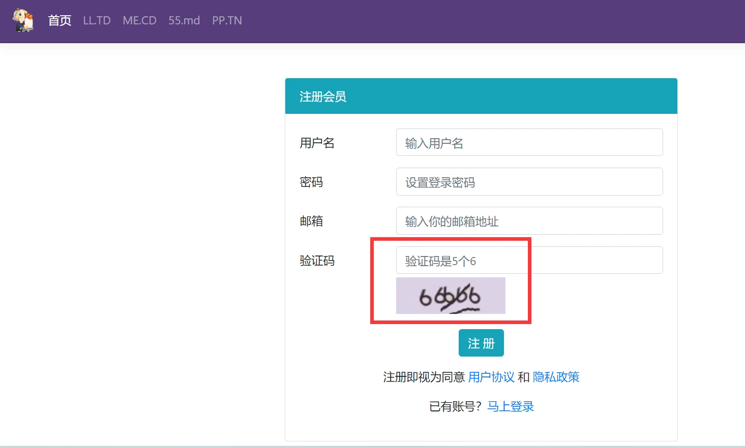 比如我现在站点验证码就是5个6,当然,我的站点是开了邮箱验证的,不怕机器去刷账号,如果你的站点没开邮箱认证,建议你多加几个字符,避免被机器刷注册。