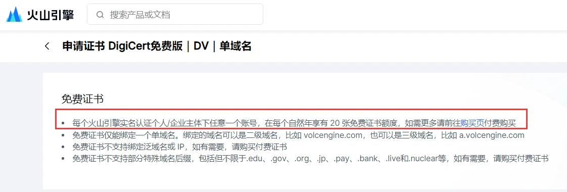 所以我的腾讯云和阿里云目前都是用完的,很多免费证书的可能都是提供3个月或者半年的,到期前要续签,有的感觉申请也麻烦一点,所以我一般会选择大厂,今天看到抖音旗下的火山引擎好像也可以申请20张免费的,如果腾讯、阿里的用完了,就去这里看看吧。【顺带一提,火山新用户注册cn首年6块钱,企业用户注册com首年1块,我注册了个cn的】
