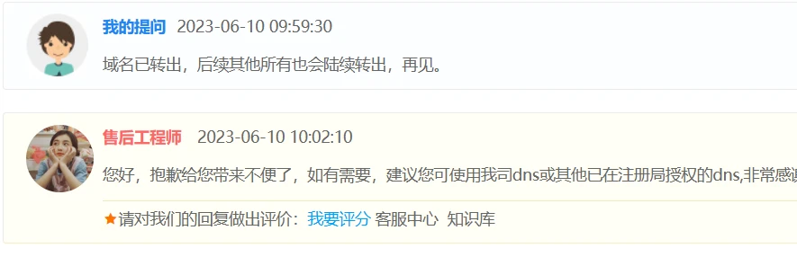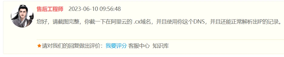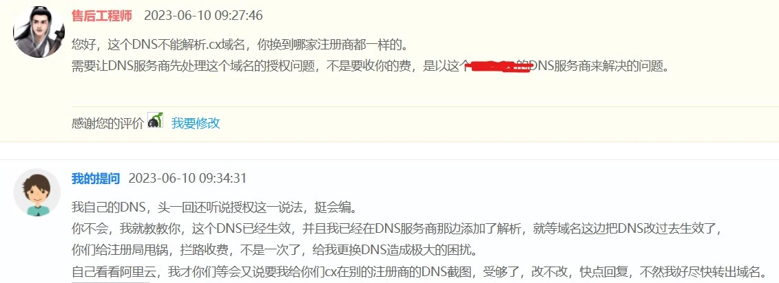 2. 如果你拒绝被割韭菜,选择工单起诉,售后工程师会让你提供这些后缀在阿里云、腾迅云等注册商的自定义DNS截图,恰好这些国别国内支持的注册商凤毛麟角且他们家又是最便宜的,所以你得花钱在其他注册商比如趣域高价注册一个给他看。