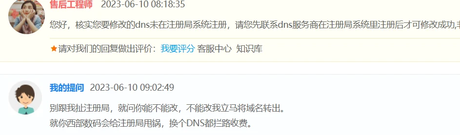 4. 其实很多人都不知道,几乎所有后缀改DNS跟注册局可以说是没有半毛钱关系,如果注册局想赚这个钱还用得着你西部数码这个中间商,在阿里云、腾讯云、中资源或者国内的其他注册商自定义DNS都是随便改,谁tm连这都给你拦路收费的,也就西部数码这一家了吧。但是有些萌新不懂,还认为这个费用收得理所当然。那我就问,域名是你的,每年续费也是你,DNS也是你的,就因为你的域名在他家,你修改自定义DNS就得收费?就好像你买了个水杯,饮水机也是你自己买的,就因为你在这家公司喝水所以每次开盖都得交费,这不是一个大品牌该有的行为。