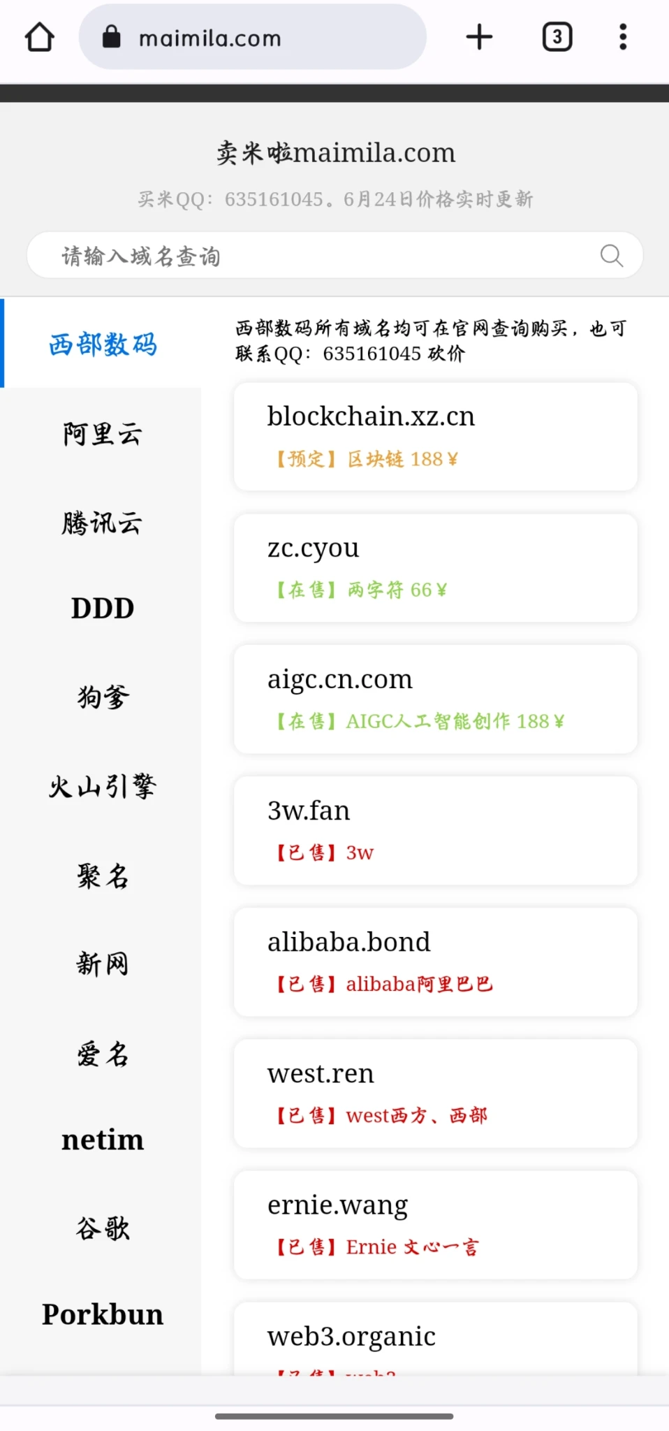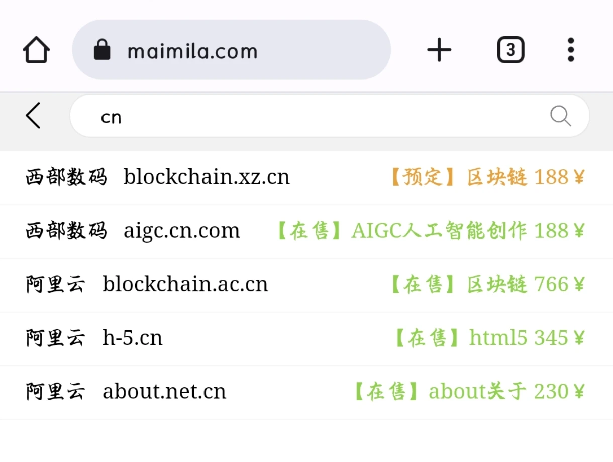 链接maimila.com 这只有一个单页,感兴趣的大佬可以自行扒一下,一个css和两个js。我是按照注册商分类的,域名较多的话可以修改成后缀分类。有的文字修改在js的Unicode字符串里面,比如搜索页面的提示文字,需要自己去查一下