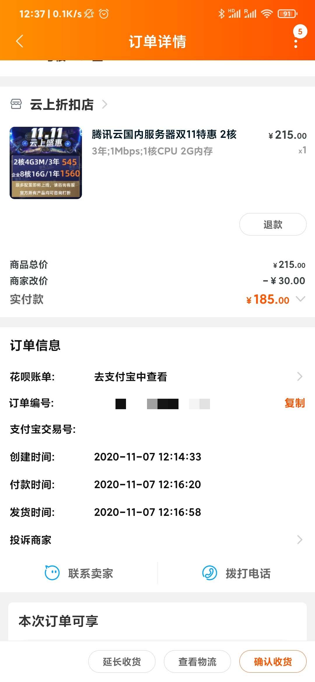 我开了一个腾讯云轻量1核2G3M 3年的,185元