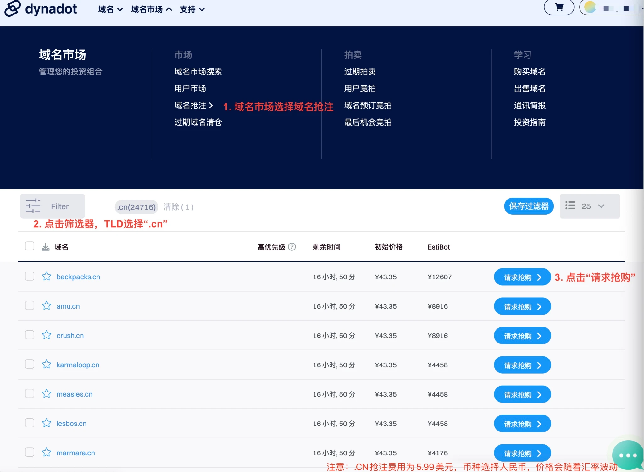 新朋友参与Dynadot抢注步骤: