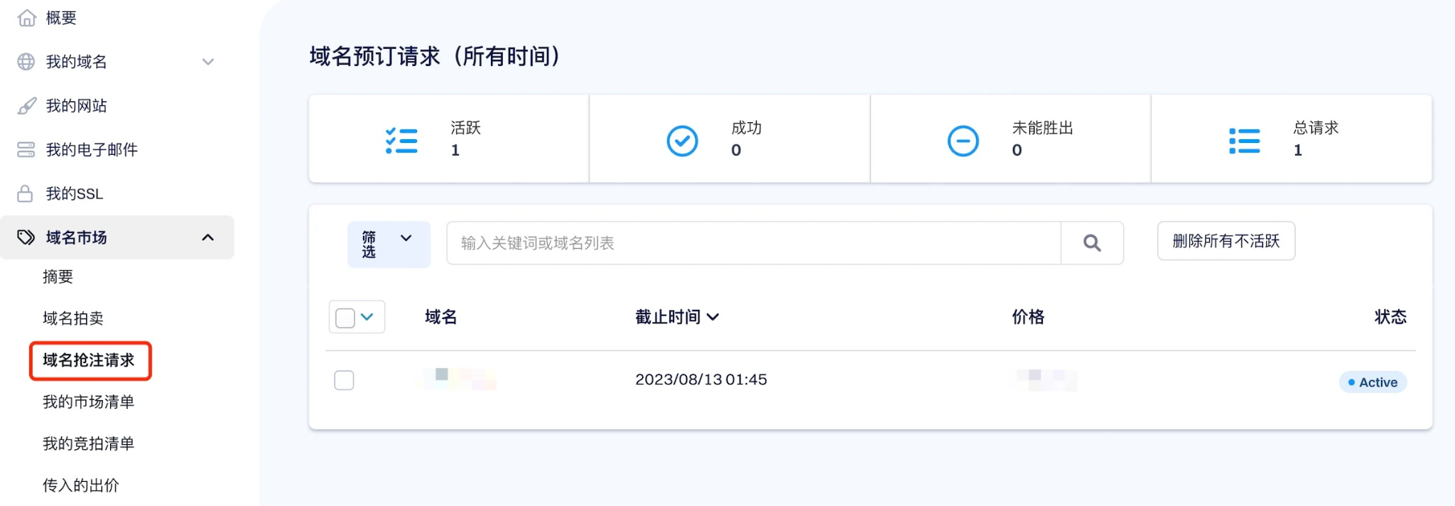 提交申请后,在用户控制面板可查看域名抢注状态