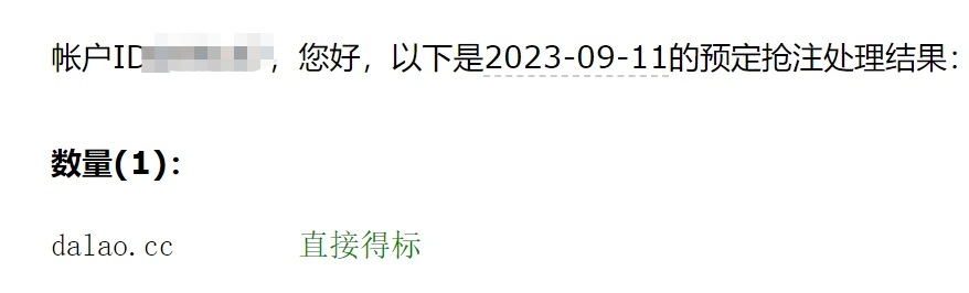 前几天看有人发dalao.cc可以预定,然后我就去预定了,刚收到邮件 直接得标了,都不用竞价 哈哈。