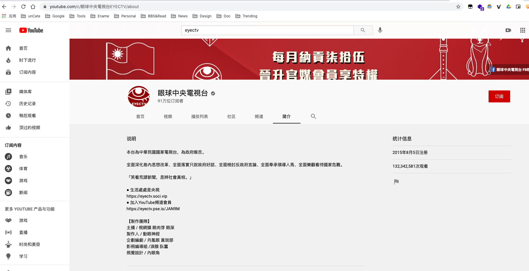 频道地址: https://www.youtube.com/c/%E7%9C%BC%E7%90%83%E4%B8%AD%E5%A4%AE%E9%9B%BB%E8%A6%96%E5%8F%B0EYECTV/featured