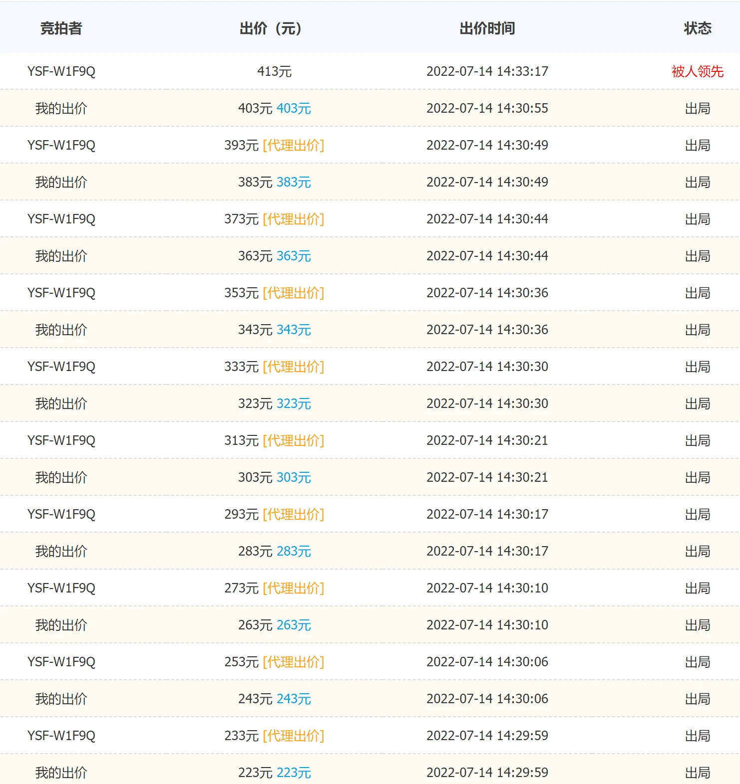 出价总是被瞬间超越。。。代理的价格不低啊。。。