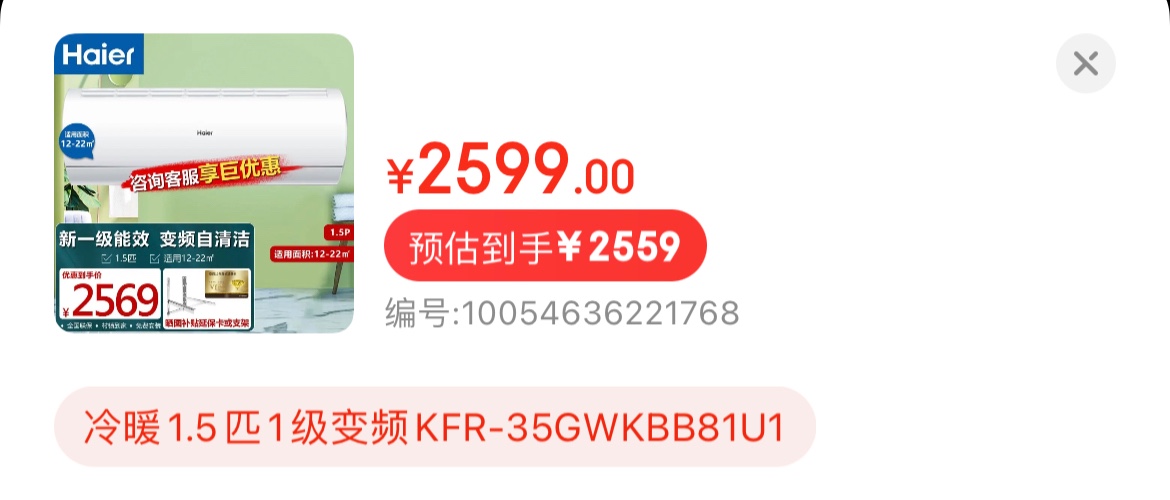 我在网上看了一些,目前看中的这个海尔的空调,价格算便宜的了,也不懂参数,这款是1.5匹,1级能效,冷暖空调,自清洁。