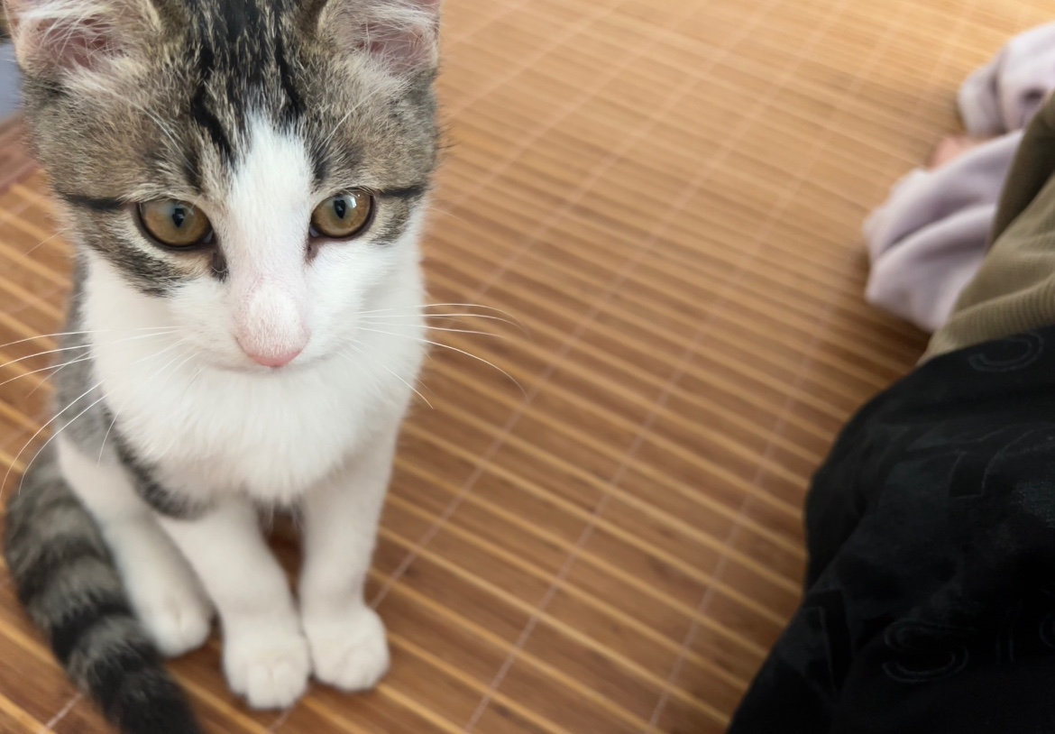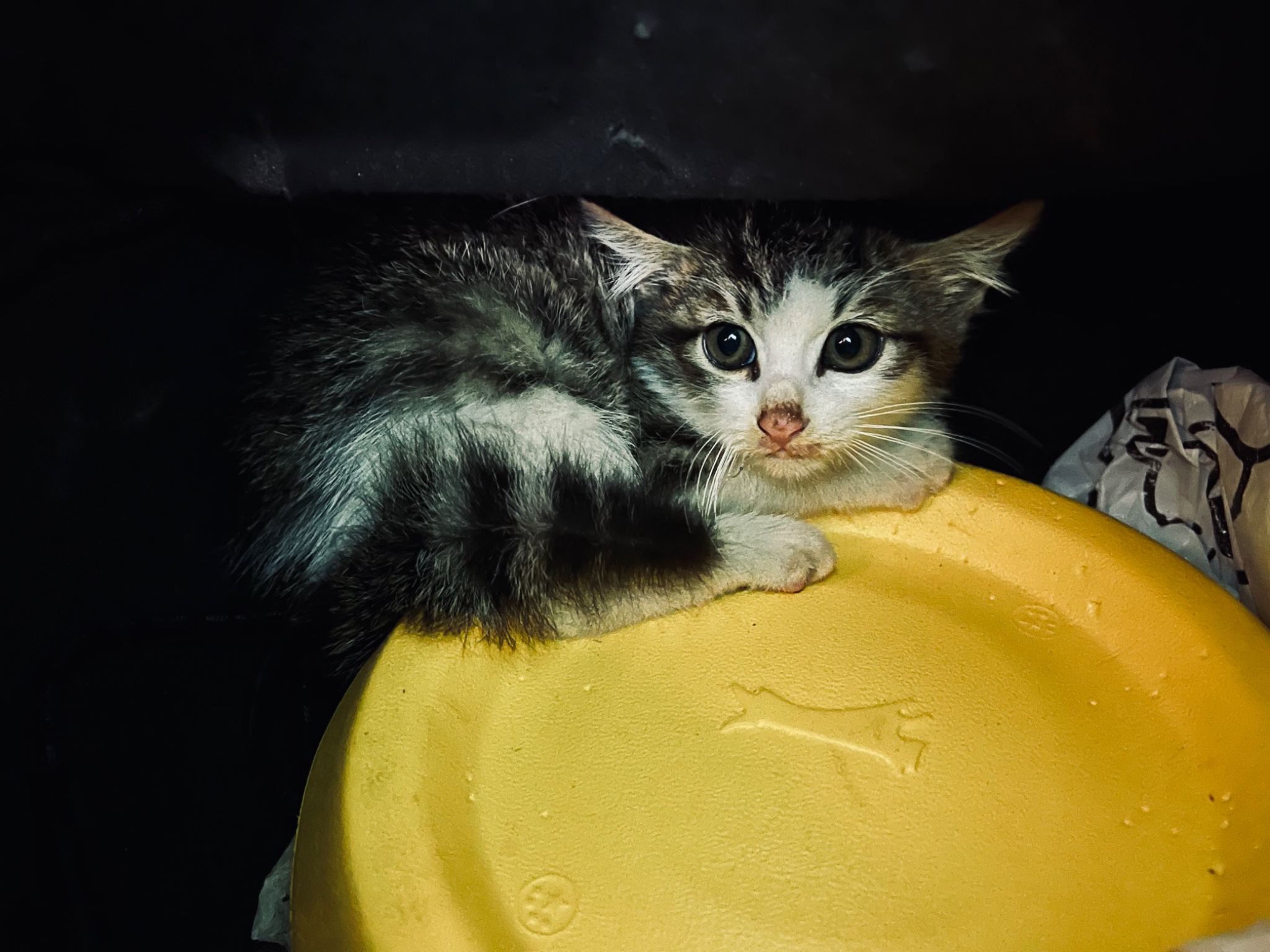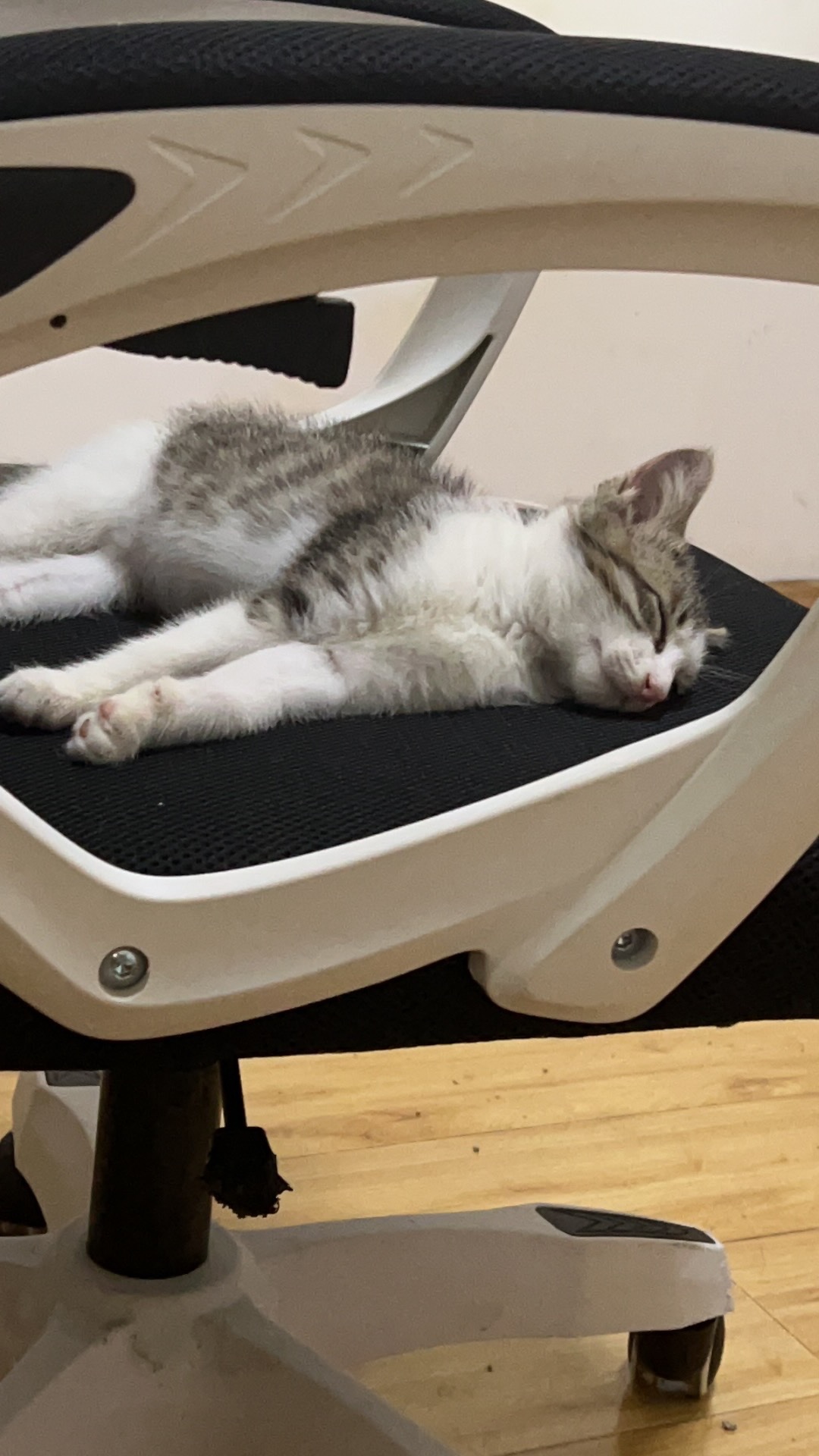猫生这辈子,被我在外边遛狗喂流浪猫时发现的,它畏畏缩缩在另外只猫的带领下走出来,当时只有我一个手掌大一点,它过来吃猫条的时候被我一把抓起,放进了电动车篮子里,趴在狗乐的飞盘上。