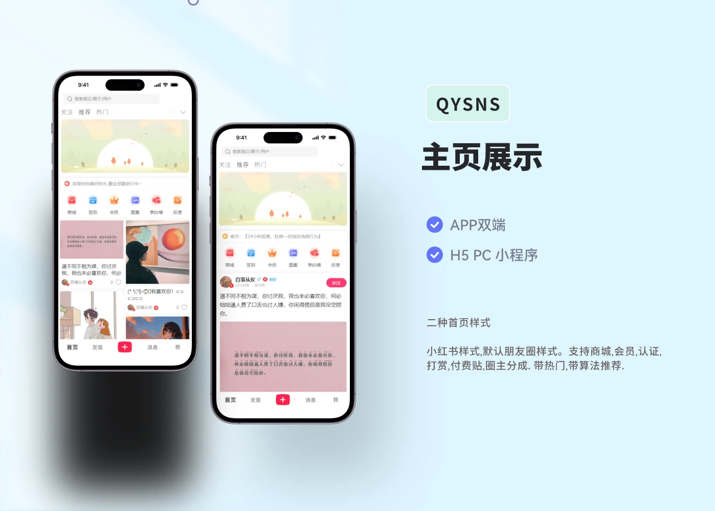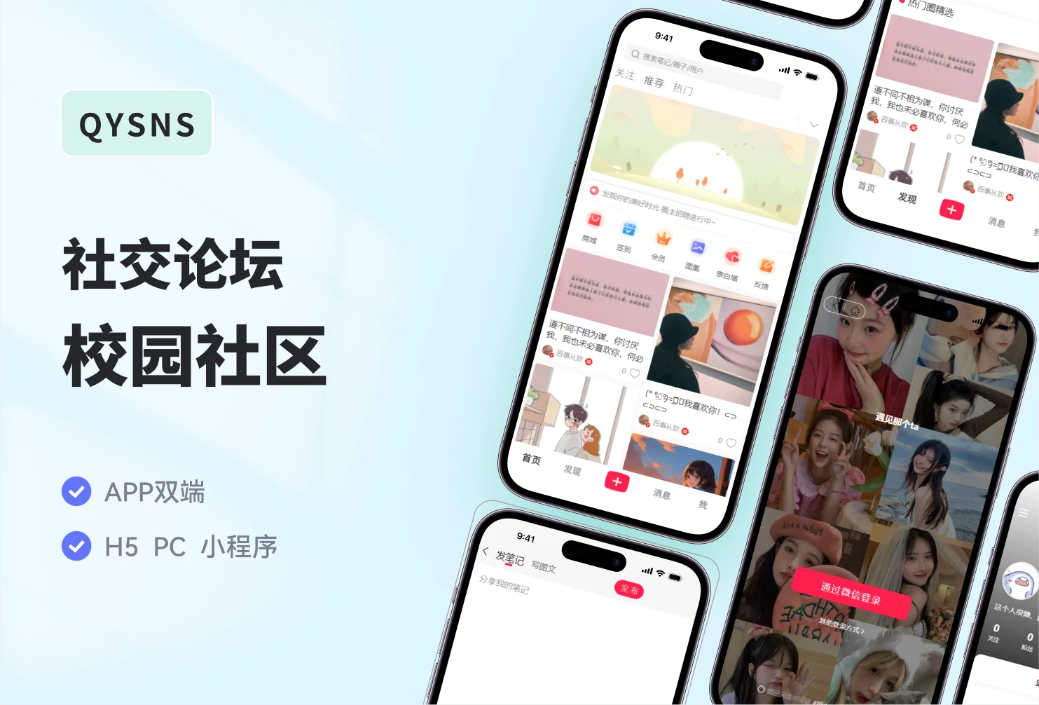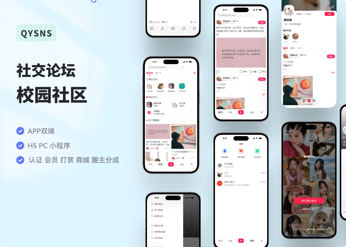 功能:小程序授权登陆,支持 app 双端,小程序,h5,pc 端,手机号登陆,发帖,建圈子、发活动。可置顶推荐帖子,关注、粉丝、点赞等。可作为圈子贴吧、小红书、校园社区、表白墙、告白墙、校园服务等。