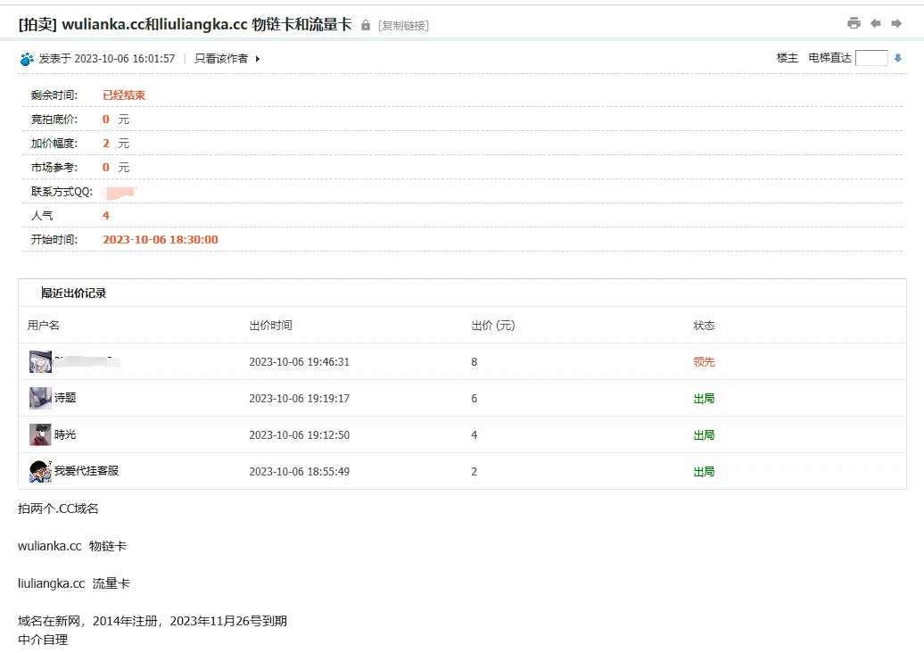 8块钱拍卖到两个关于流量卡和物联卡的CC域名