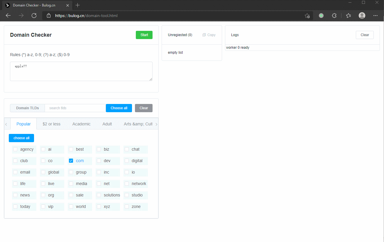 在浏览器里打开查询页面,输入需要查询的域名名称(支持通配符: (*) a-z, 0-9; (?) a-z; ($) 0-9),勾选需要查询的域名后缀就可以进行域名注册状态的查询。