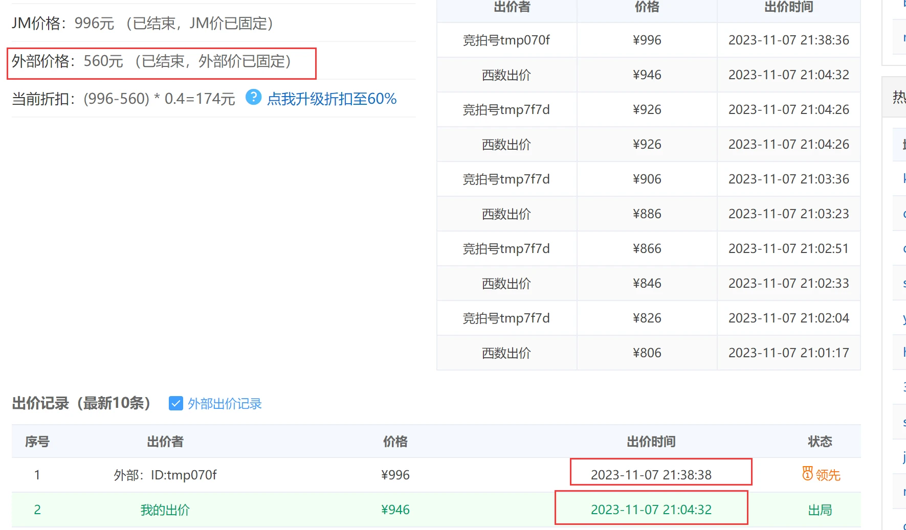 当我出价到946元以后,西部一直显示并未结束,然后再次倒计时4分钟,若干次这么的倒计时,中间我去聚名看了一下,聚名的价格也是停留在560元,这个事实上我没搞懂,到底是什么情况?
