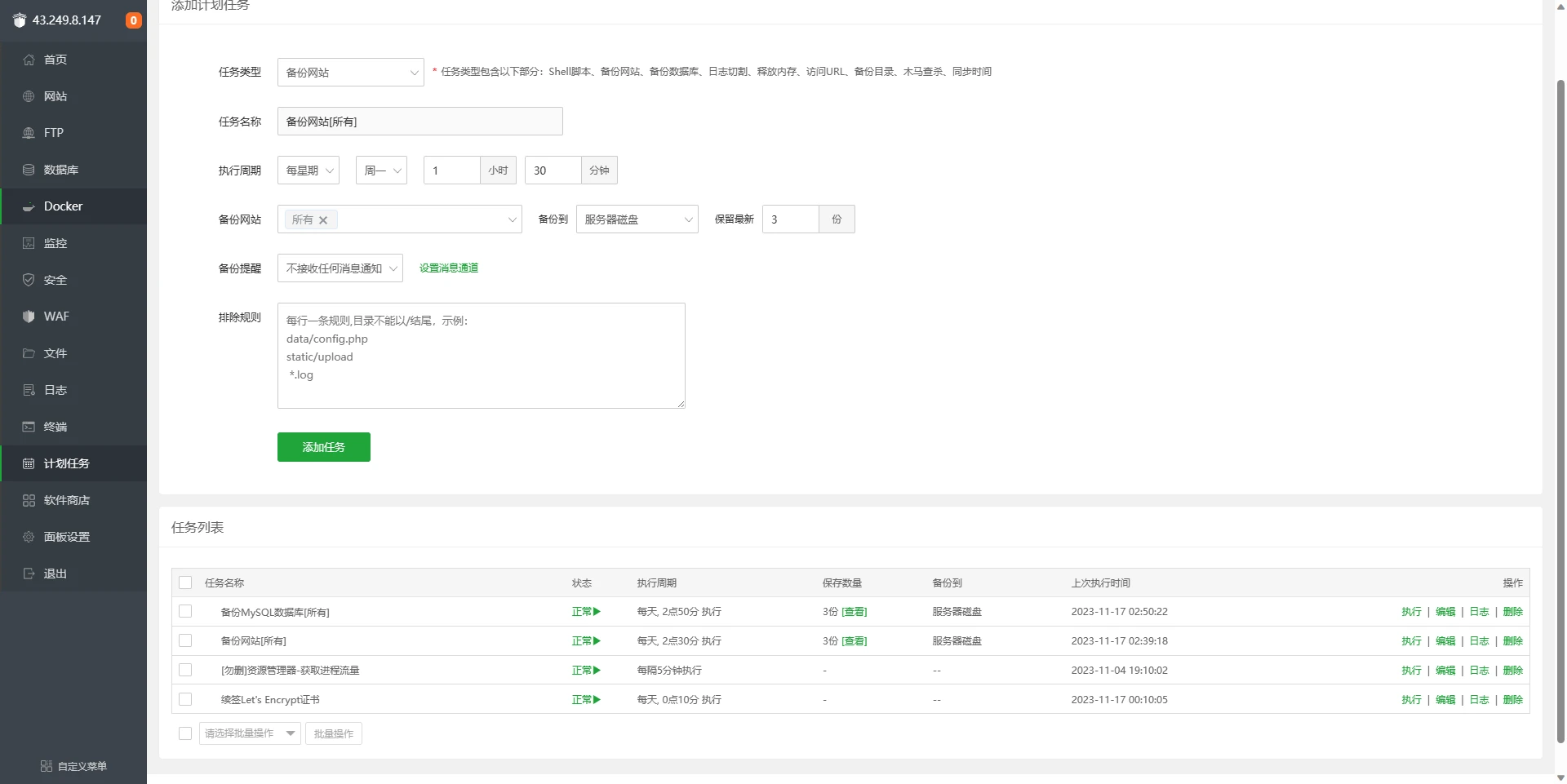 1、用宝塔创建计划任务,备份所有网站数据库