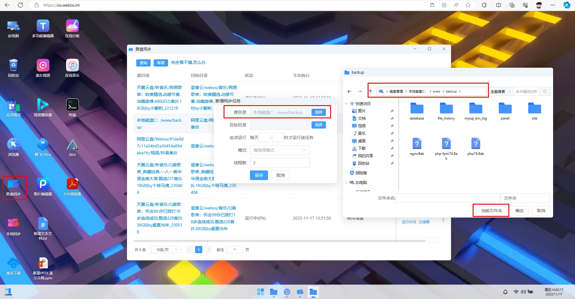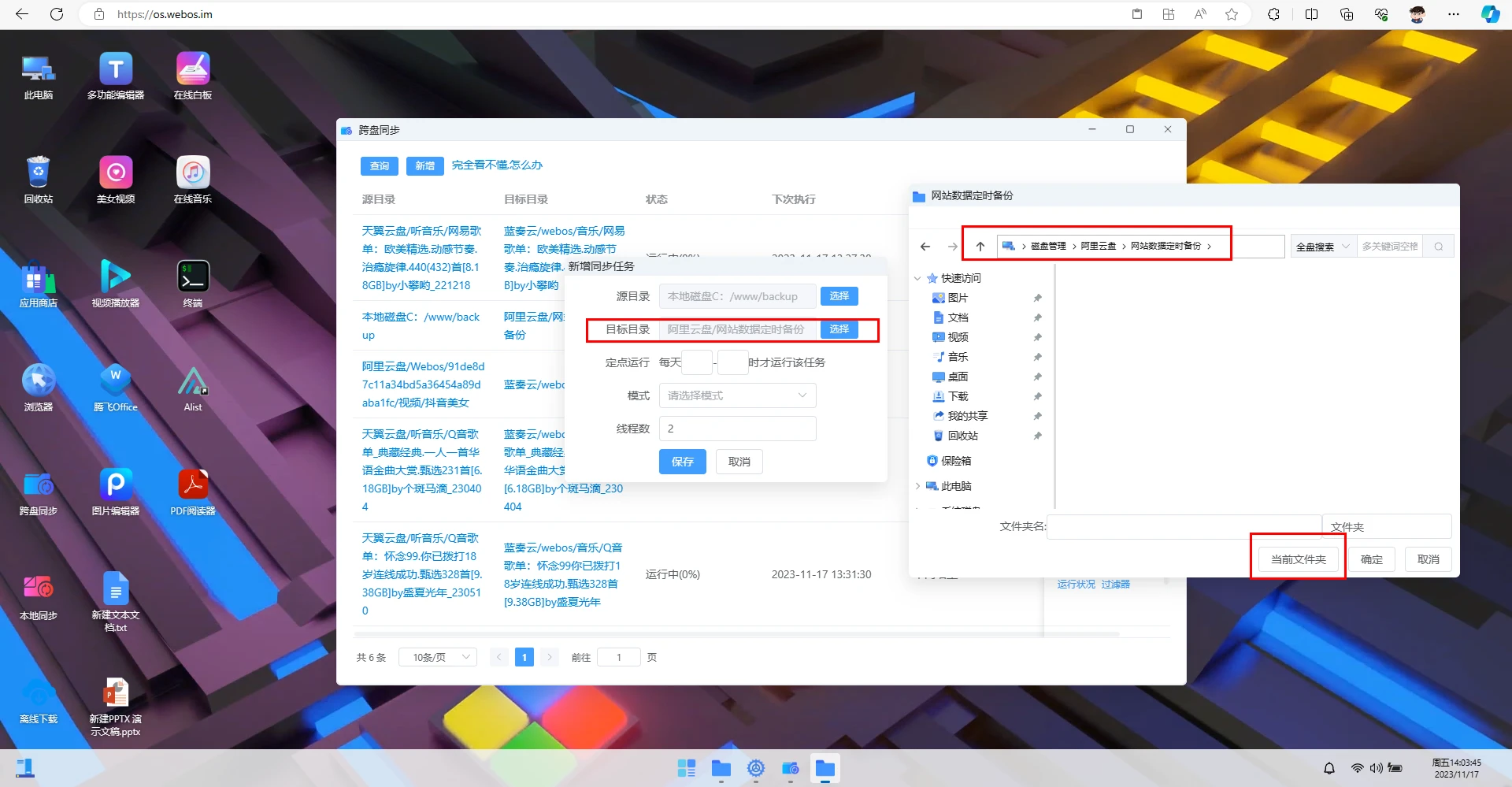 选择目标目录 这里已上传至阿里云盘为例 新建同步文件夹 选择当前文件夹