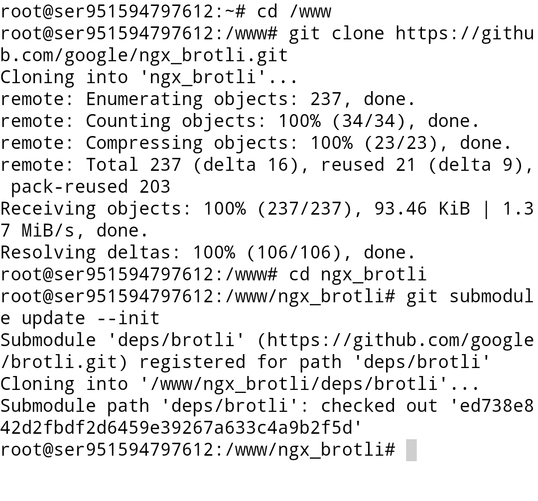 cd /www git clone https://github.com/google/ngx_brotli.git cd ngx_brotli git submodule update --init