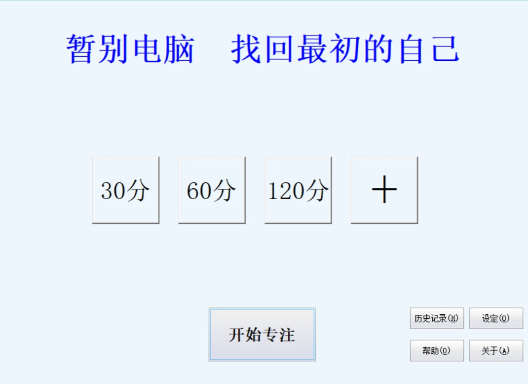你还在因为控制不住自己的手而碰电脑吗?那就试试这个东西吧!这是一款暂时让你的电脑进入专注模式的小软件,你可以设置10分钟至5小时的专注时长纠正你的自制能力,提高生活质量!基于易语言编写,且代码开放,你可以通过这个软件来使你的电脑暂时处于不能操作的状态,以约束自己使用电脑的时间。