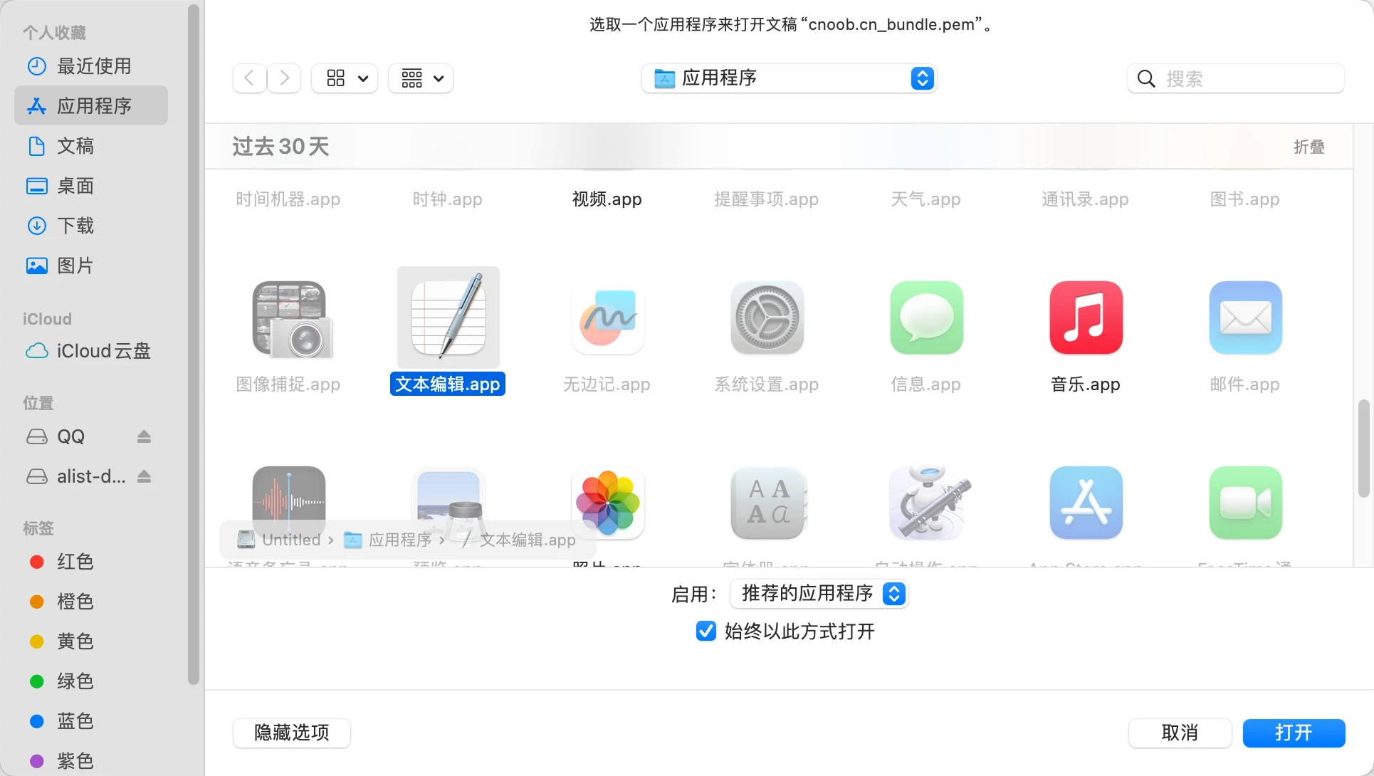 每次还得找这个文本编辑来打开,勾选始终用这个app,却只对当前文件生效,下次可以直接打开,换一个文件名的又得重新找...