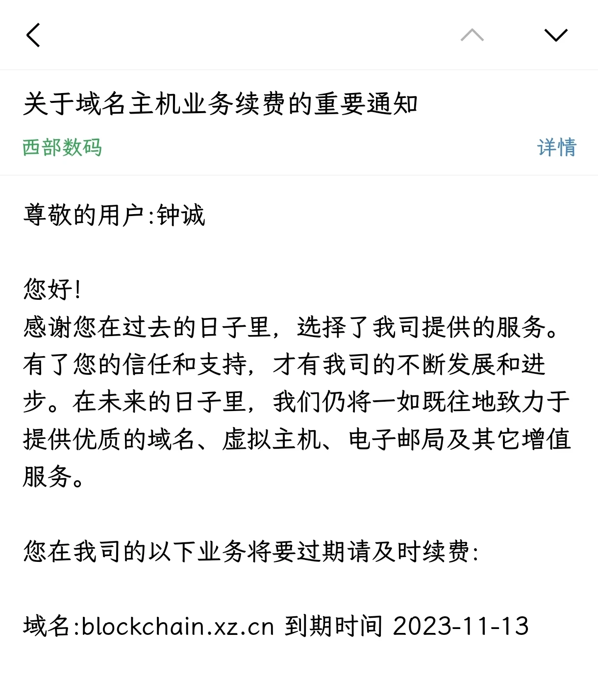 我又去邮箱找了西部当时通知的邮件,确实是这个域名今年11月到期,我也看了我的账单,这个域名是去年11月注册的,今年到期,我也没续费过,为啥我删除之后,这域名莫名其妙增加了一年。难道西部自己续费了?