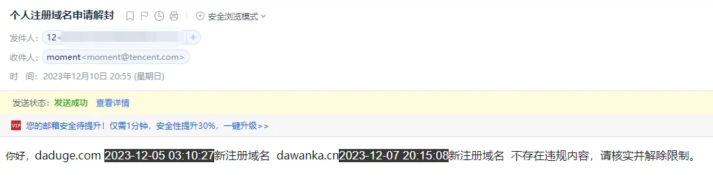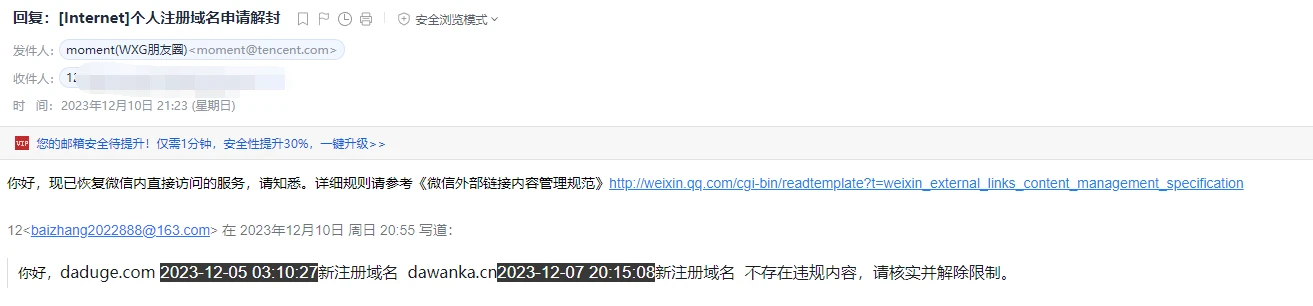 邮件内容:你好,你的域名 2023-12-05 03:10:27 新注册域名 你的域名2023-12-07 20:15:08新注册域名 不存在违规内容,请核实并解除限制。