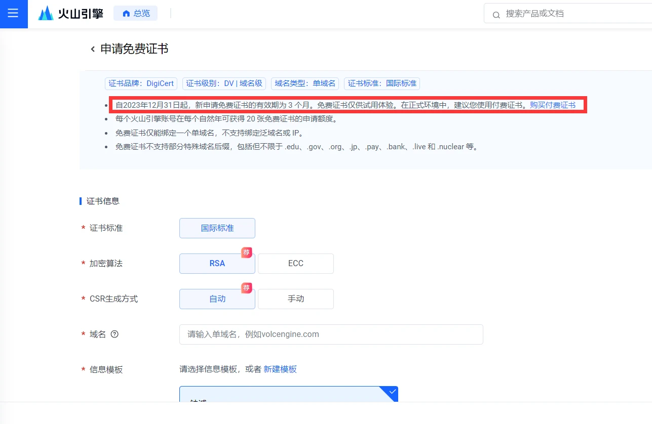 继阿里、西部之后,火山引擎也跟上了步伐,今年起也只提供3个月的免费证书了