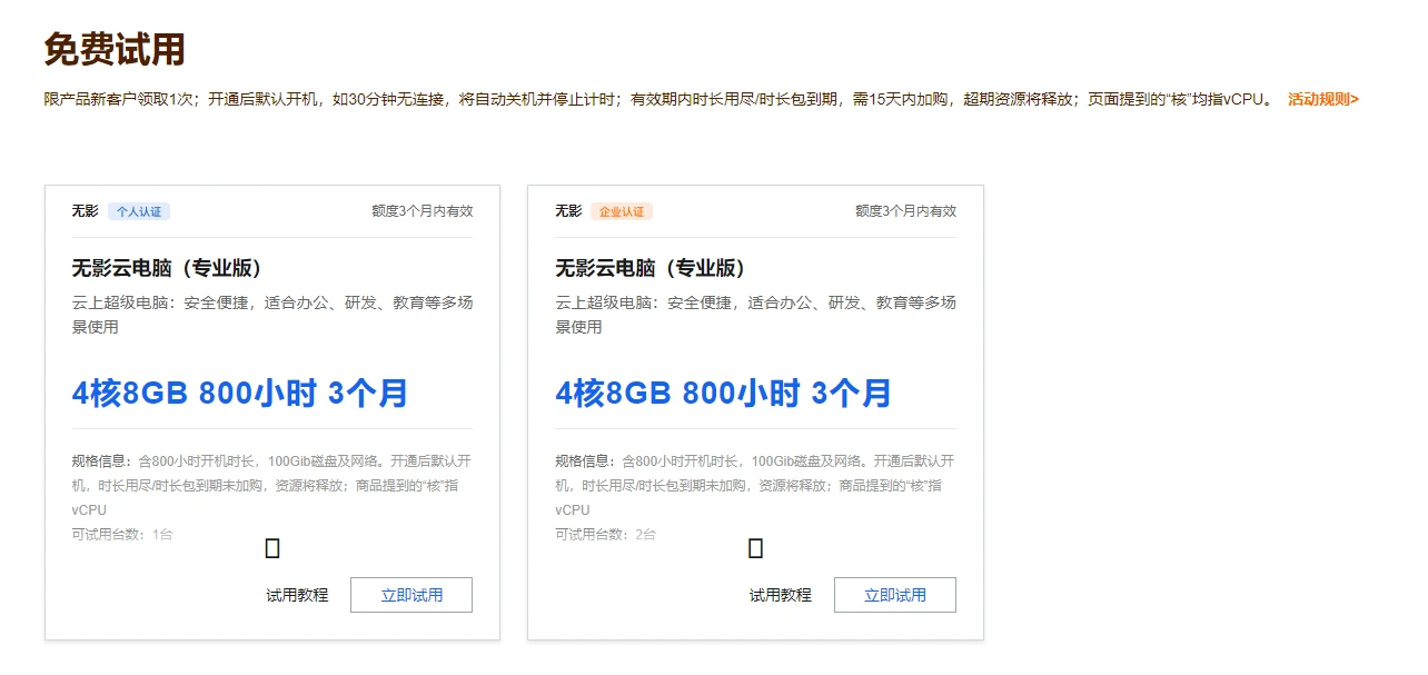 阿里云无影云电脑免费体验 3 个月,800 小时。上车