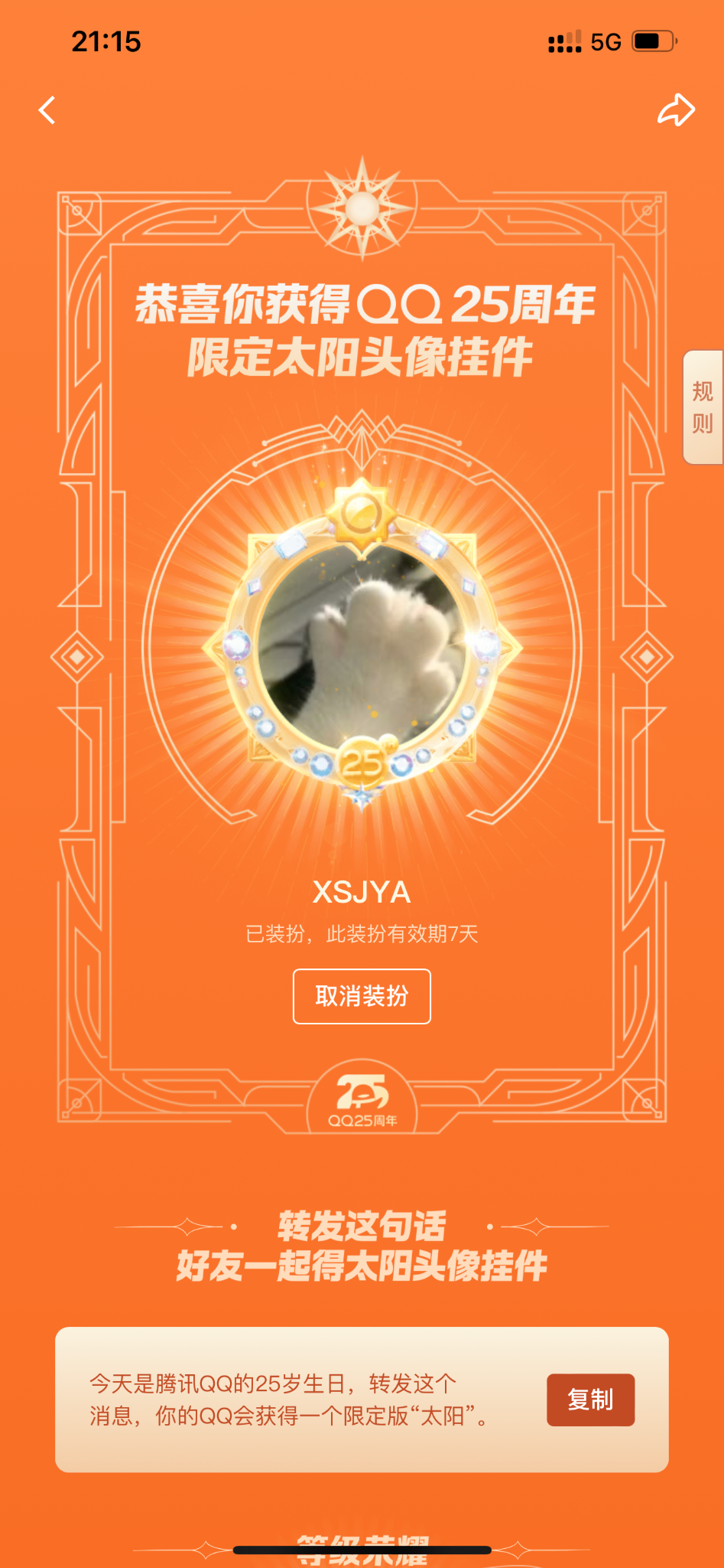 今天是腾讯QQ的25岁生日,转发这个消息,你的QQ会获得一个限定版“太阳”。
