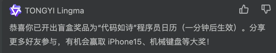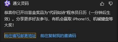 https://developer.aliyun.com/topic/lingma/activities/202403?taskCode=14508&recordId=02840c5a5fe713b1a43171fa47d0cce9#/?utm_content=m_fission_1 「通义灵码 · 体验 AI 编码,开 AI 盲盒」