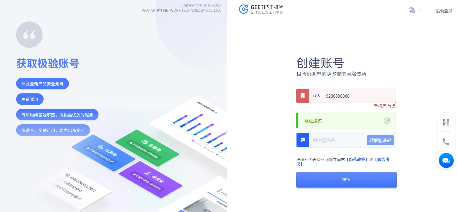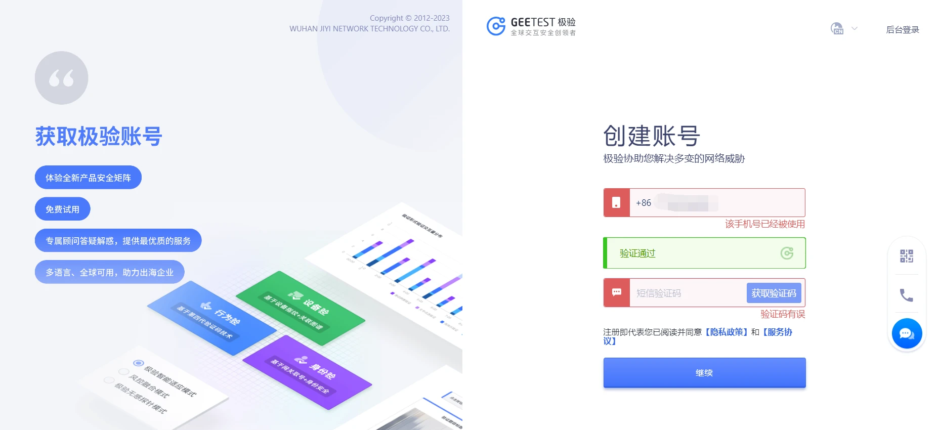 我今天去极验geetest.com注册一个账号,想着自己是不是注册过了,然后尝试注册的时候,确实提示手机号已经注册了