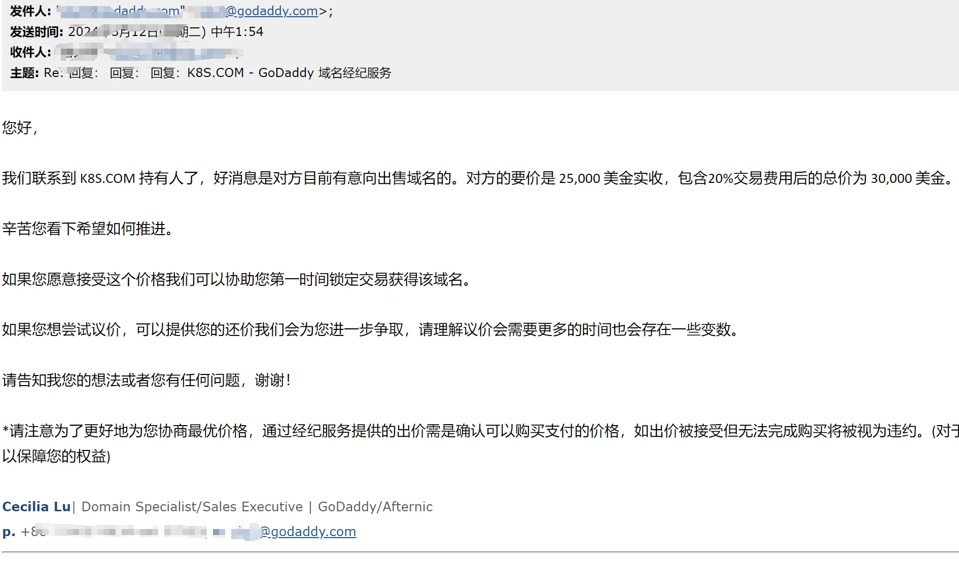 看上了一个域名K8s.com ,查询发现是在狗爹平台,但是没有在任何平台挂出来出售,所以也就无法靠自己联系卖家。只能花钱购买狗爹的域名经纪人帮我联系。