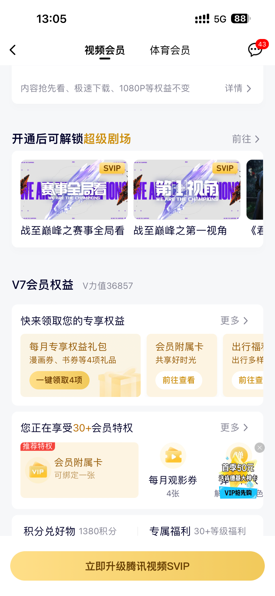腾讯视频会员附属卡 70 一年