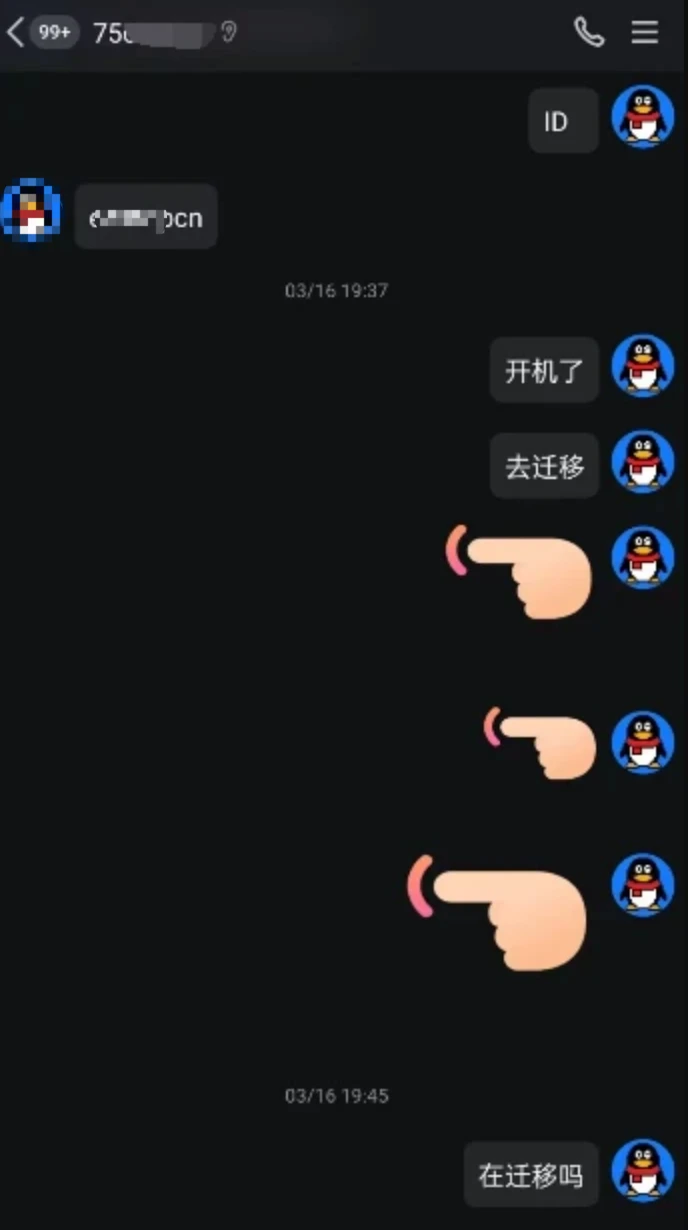 然后我们QQ又私聊,因为迁移期过了,但机器还没下柜,我又单独给他开机让他迁移