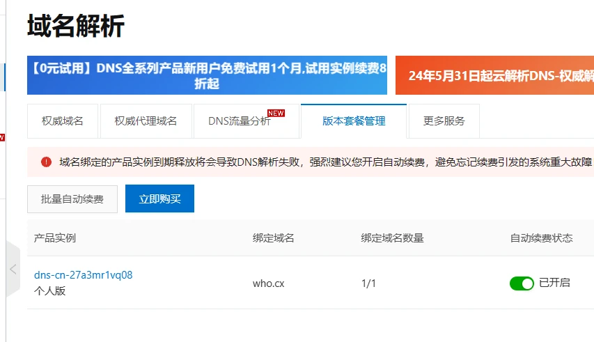 1. dnssec这里以阿里云为例,需要开通阿里云的云解析DNS套餐,¥19/年,开通后绑定你的域名: