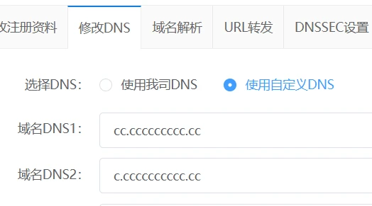 4. 到域名注册商将域名的dns改成你自定义的dns: