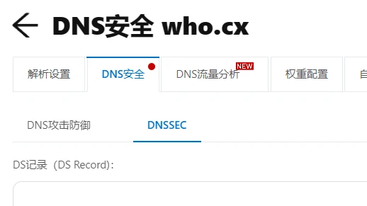 6. 在阿里云的云解析的DNS安全里获取域名的dnssec的ds记录,到域名注册商处部署: