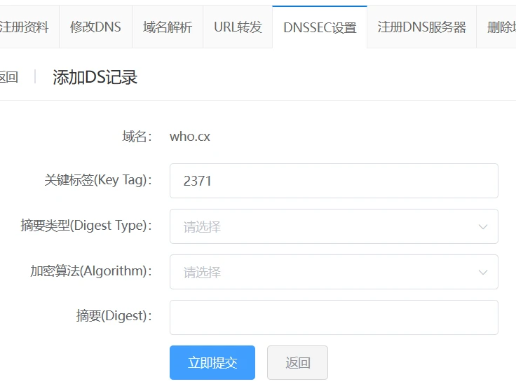 到域名注册商处填写获取到的ds记录: