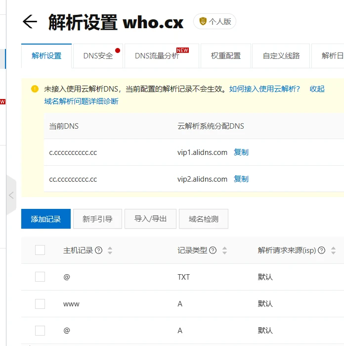 想要将dns域名的dns也使用自建dns,需要dns域名也都开通云解析套餐,并到阿里云添加解析,1份¥19的套餐只能绑定1个域名,成本高不推荐。