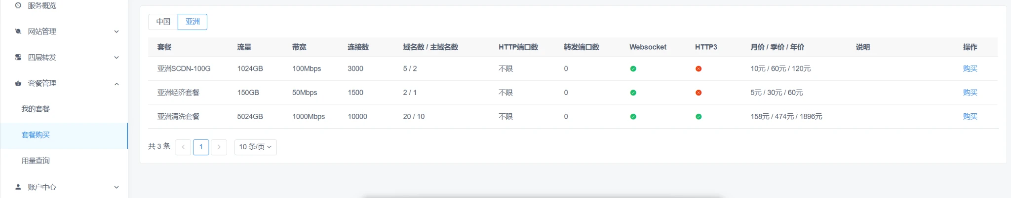 有中国套餐和亚洲套餐都是一元起