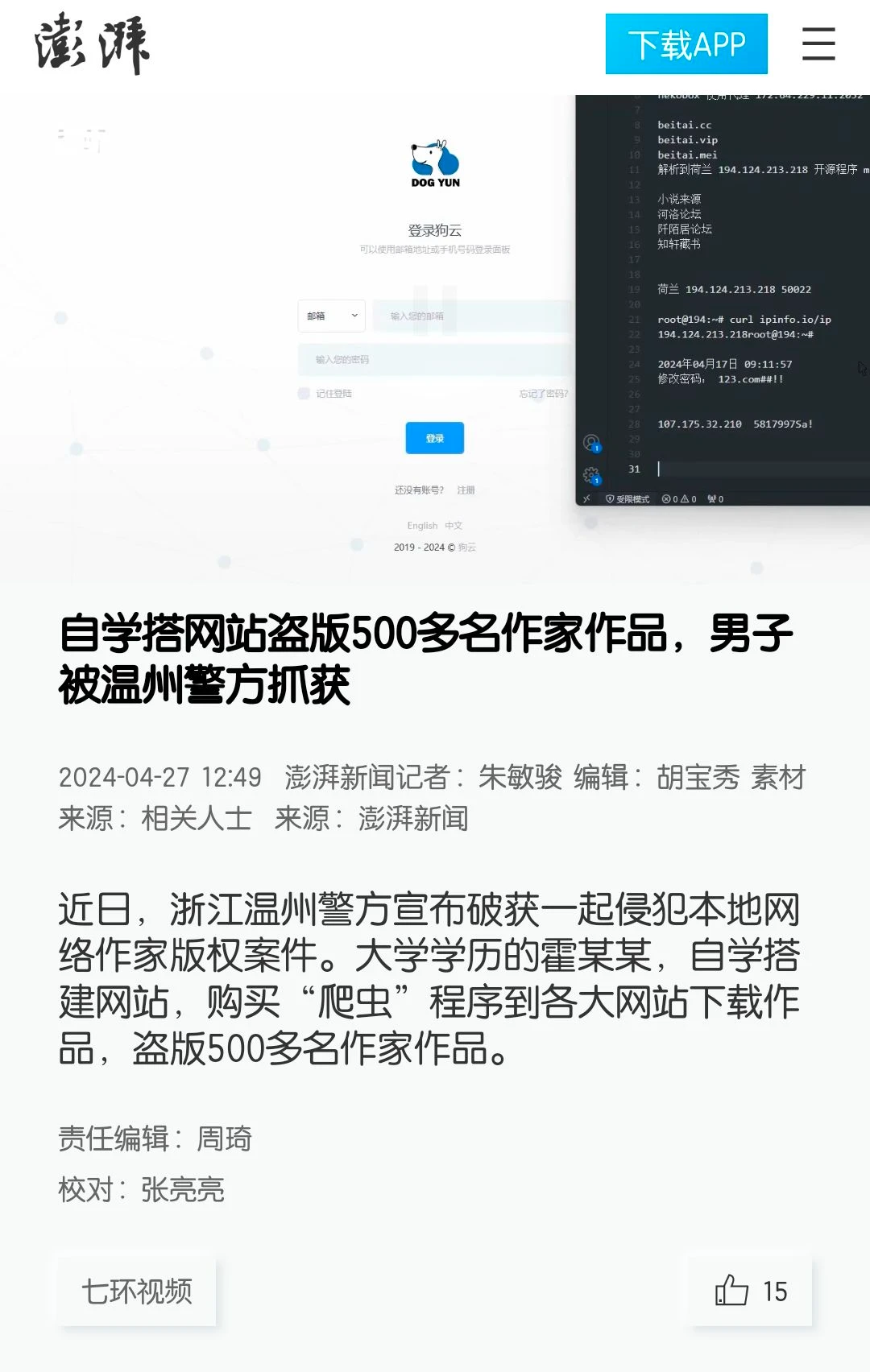 某盗版网站侵权作家作品,浙江温州警方破案时发现境外服务器是狗云