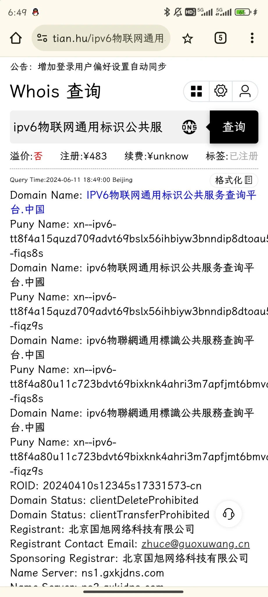 比如国旭注册的【ipv6物联网通用标识公共服务查询平台.中国】,在who.cx查询的时候,会自动忽略ipv6,而在tian.hu没有这样的情况