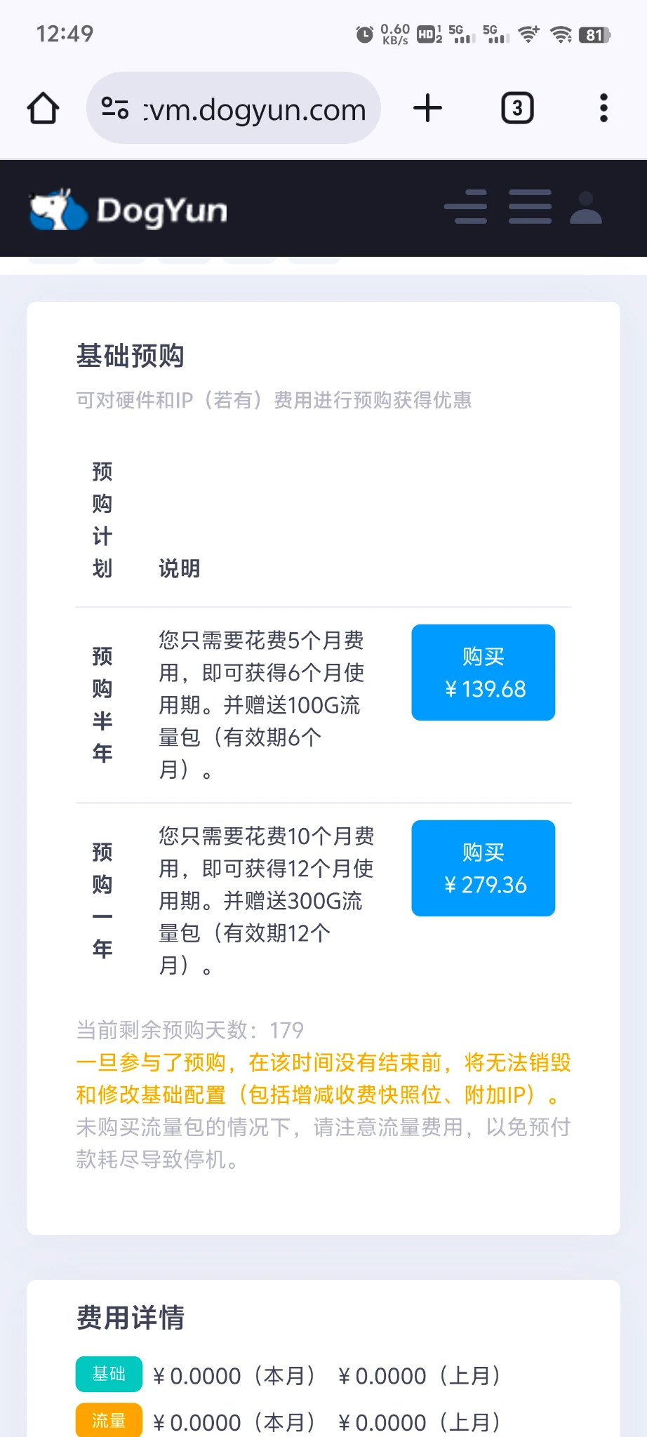 狗云5折香港kc 动态,1h2g预,付费购买还有179多天。 余额还有九元。 88元。