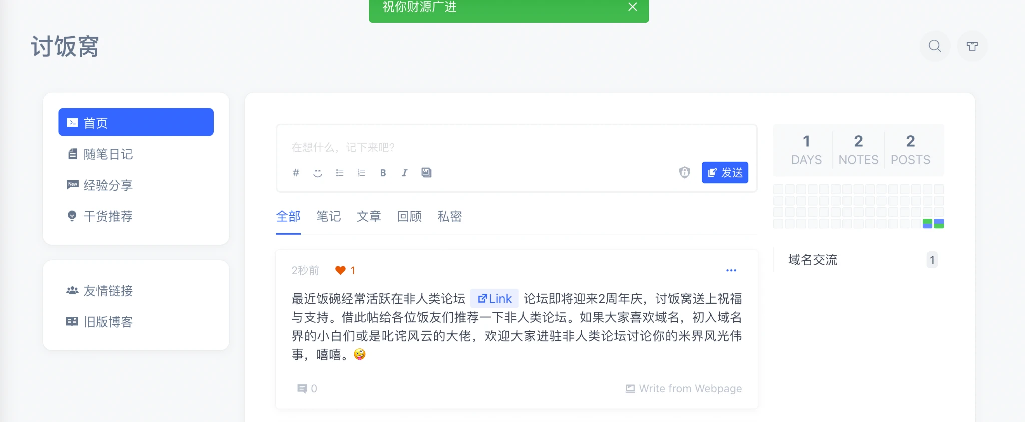 讨饭窝的故事:tao.fan 这个域名是我在某一天深夜睡不着去逛了一圈西部数码一口价市场发现了它,当时有个zhefan虽然比taofan便宜而且也没溢价,但是我就是没看上它,后面才知道taofan是论坛的一个老哥持有的,哈哈哈该死的缘分。不久前通过了BA,后面慢慢的发现我越来越喜欢这个拼音域名了,希望能长久的把它做成个人博客,虽然续费有点小贵但是情怀仍然催动我前进。博客我已经写了一段时间了因为旧版使用的是typecho,在个性化操作上有很多的不方便,缺乏开发者的进驻导致很多插件和主题都有搁置更新的风险,当时选择使用typecho搭建讨饭窝是看上它的轻便,但是我在使用了一段时间后发现越来越不方便,最后无奈的改回了Wordpress。不知道未来讨饭窝还会经历什么,但是在非人类论坛遇见了讨饭窝也算是个美好的开始吧。